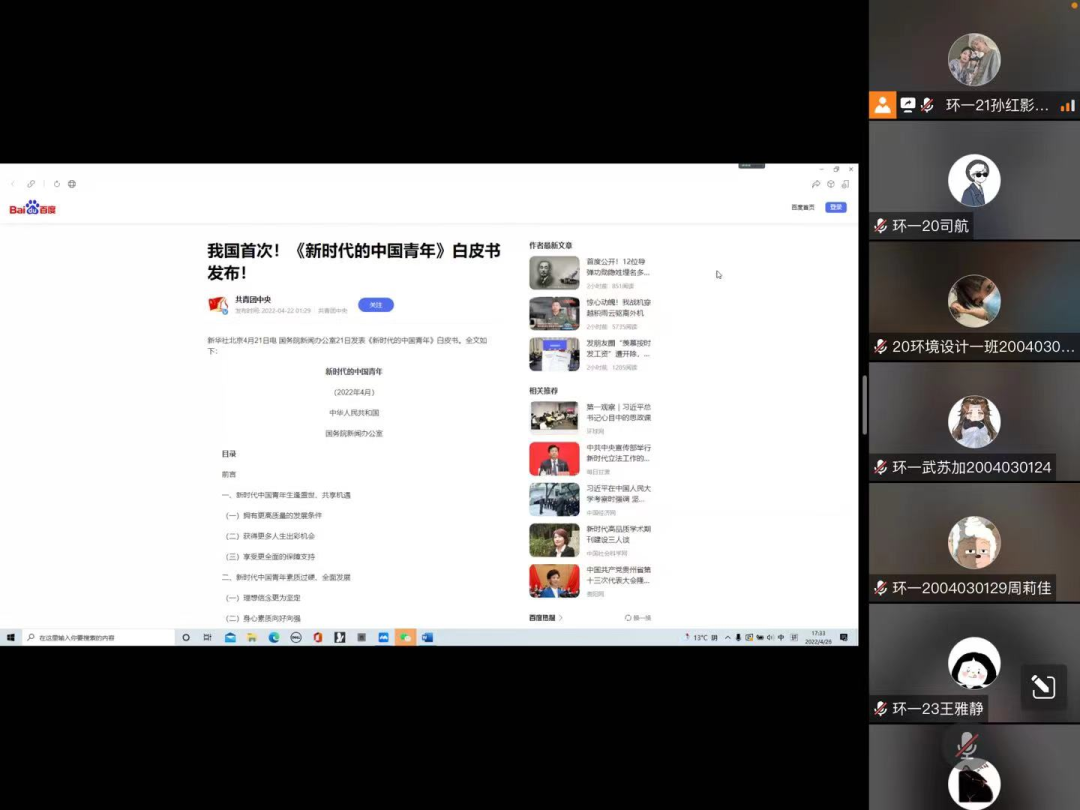 会议上各班团支书对《新时代的中国青年》白皮书内容做了简要介绍,他们提到《新时代的中国青年》白皮书,是我国首次专门就青年群体发布的白皮书。白皮书全面介绍了新时代党和政府为青年发展创造的良好条件、取得的巨大成就,充分展现了新时代中国青年奋进新征程、建立新时代的青春担当,是一部记录新时代中国青年发展事业成果、反映新时代中国青年精神风貌的重要文献。随后,部分同学线上与大家分享了自己对《新时代的中国青年》白皮书的学习心得,全体参会者认真学习、深刻领会,掀起了《新时代的中国青年》白皮书学习热潮。