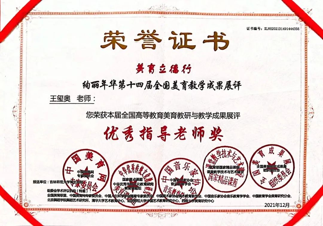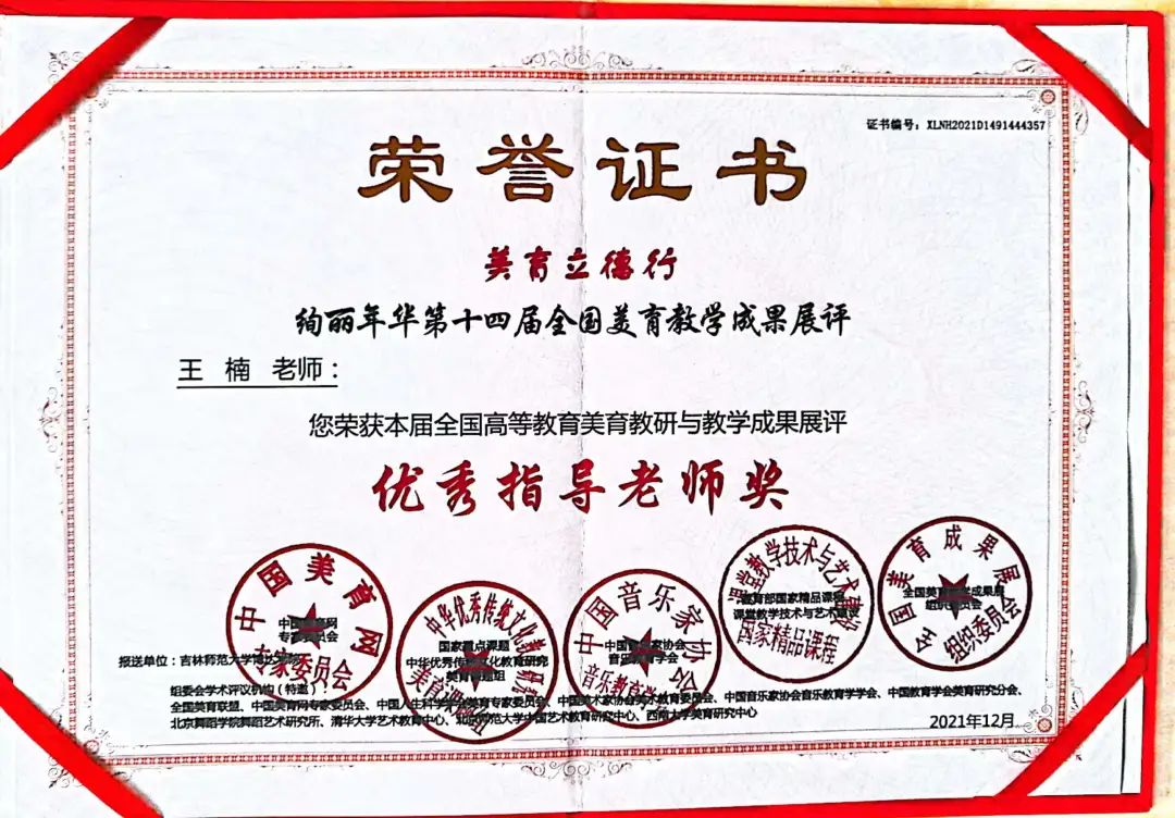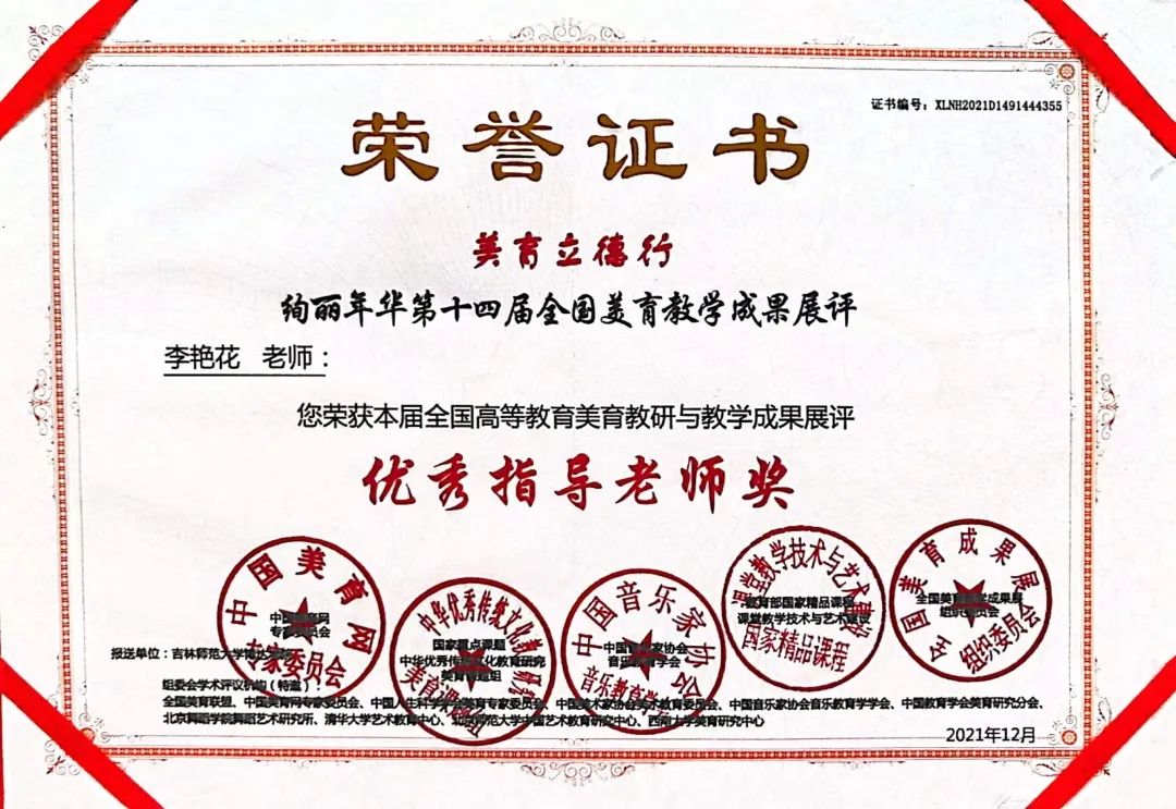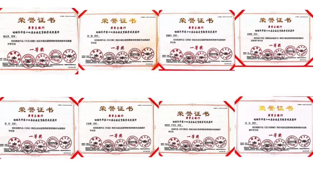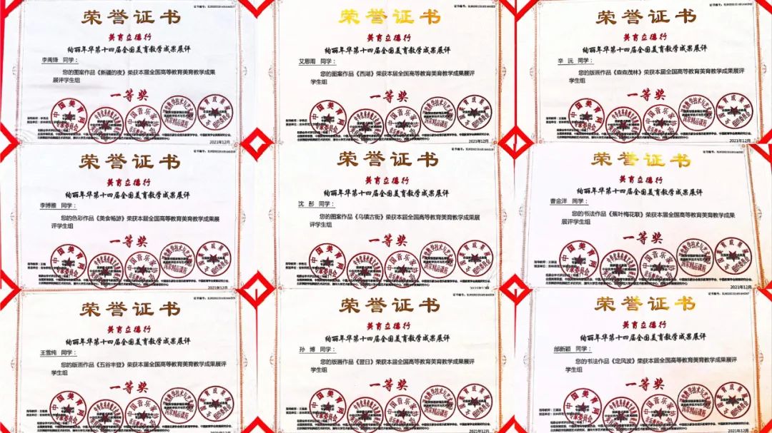 第十四届“全国高校美育教学成果展”评选结果揭晓,美术学专业学生积极参加比赛,共计54名同学获奖,其中一等奖21件,二等奖24件,三等奖9件,李艳花老师、王楠老师、王湛迪老师、王玺奥老师获得优秀指导教师的优异成绩。