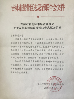 为发挥志愿者的引领示范作用,进一步增强志愿者服务积极性。近日,吉林市船营区志愿者联合会对疫情防控志愿者吉林师范大学博达学院艺术学院2017级环境设计专业学生马一平进行了表彰。