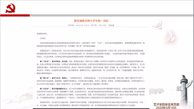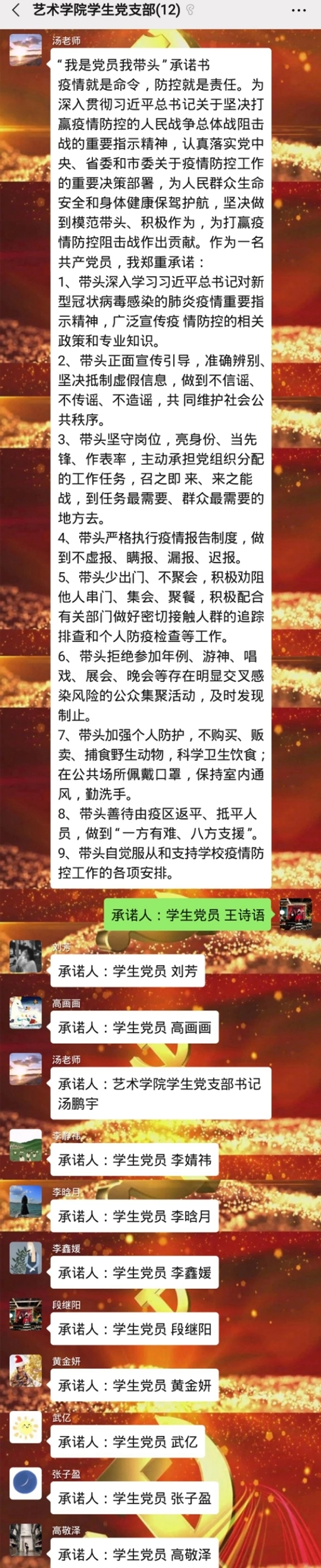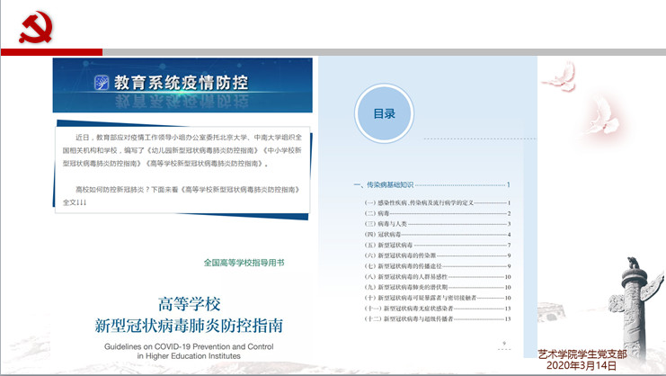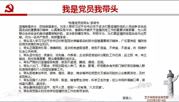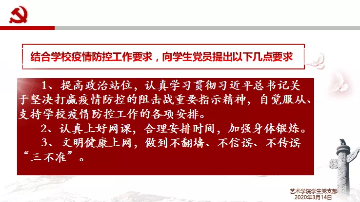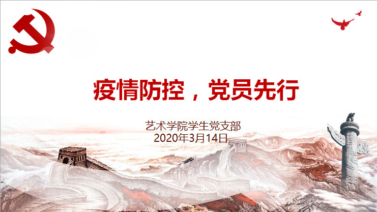 为深入贯彻习近平总书记关于坚决打赢疫情防控的人民战争总体战阻击战的重要指示精神,认真落实党中央、省委和市委关于疫情防控工作的重要决策部署,艺术学院学生党支部于3月 日开展主题为“疫情防控,党员先行”线上教育活动。本次活动分为五部分内容。