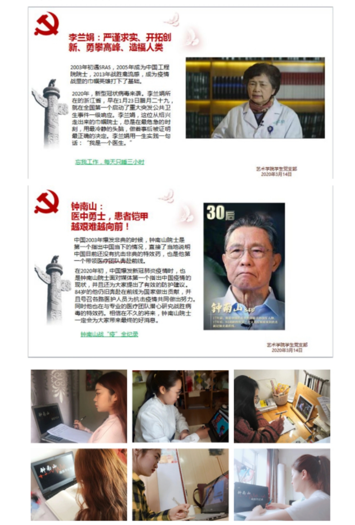 首先,通过观看关于钟南山院士和李兰娟院士在疫情防控工作中的视频,我们的学生党员从两位优秀党员身上学习到严谨求实,不畏艰苦和开拓创新的精神。在如此严峻的疫情形势下,84岁高龄的钟院士和73岁的李院士再次挺身而出,义无反顾地冲在了抗疫最前线,为人民群众奉献力量。