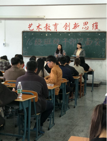 10月18日,吉林师范大学博达学院艺术系在2221教室举行16级班级干部见面会。出席本次会议的有艺术系辅导员刘丽,辅导员朱烁,学生会主席宋爽以及15级学生干部代表、16级全体班级干部。