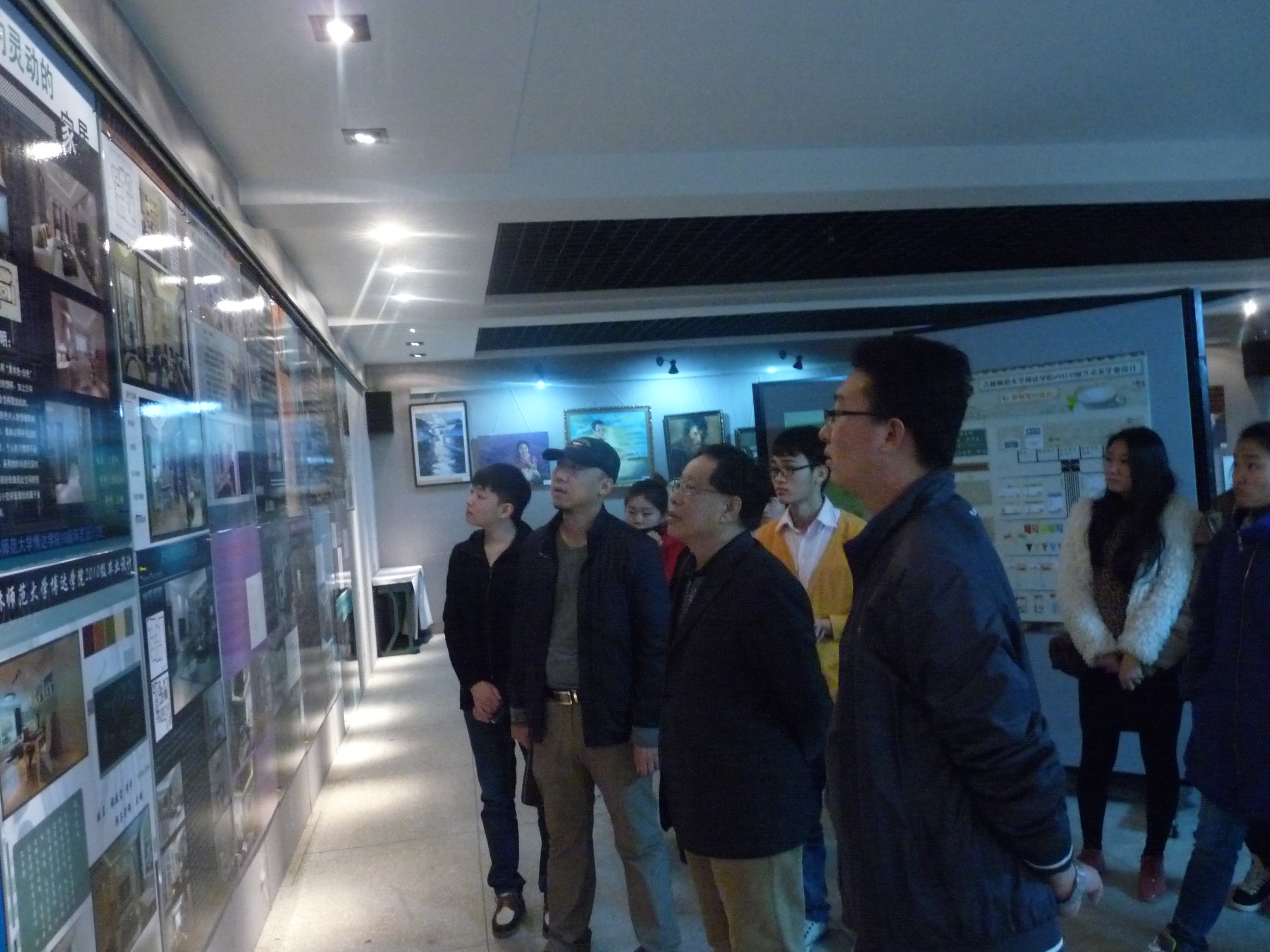 图为张笑庸院长在艺术系副主任刘松松、学工办主任崔景朋的陪同下参观毕业展。