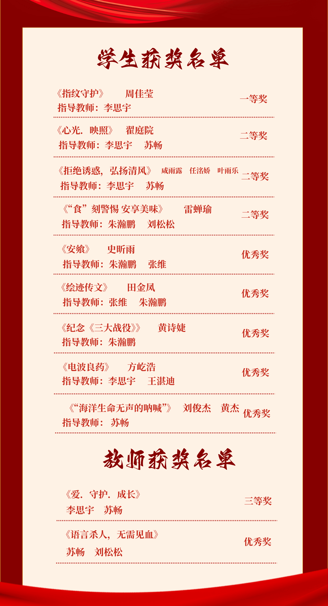 近日,由中共吉林省委宣传部、省市场监管厅等部门联合主办的“烽火岁月忆先烈,薪火相传谱华章”第十届吉林省公益广告大赛圆满落幕。艺术学院师生在此次大赛中表现优异,共获多项荣誉,充分展现出艺术学院师生扎实的专业能力与深厚的社会责任感。