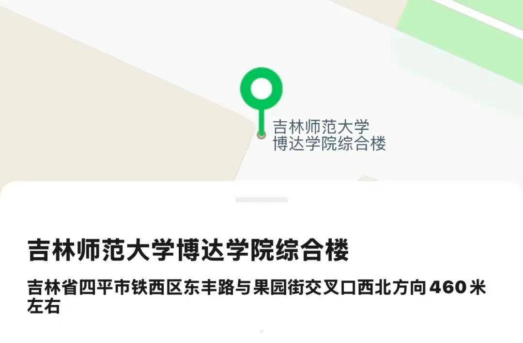 4.如果你是开车到学校可以按照上图地址直接导航到学校正门:(吉林师范大学博达学院综合楼)吉林省四平市铁西区东丰路与果园街交叉口西北方向460米左右。