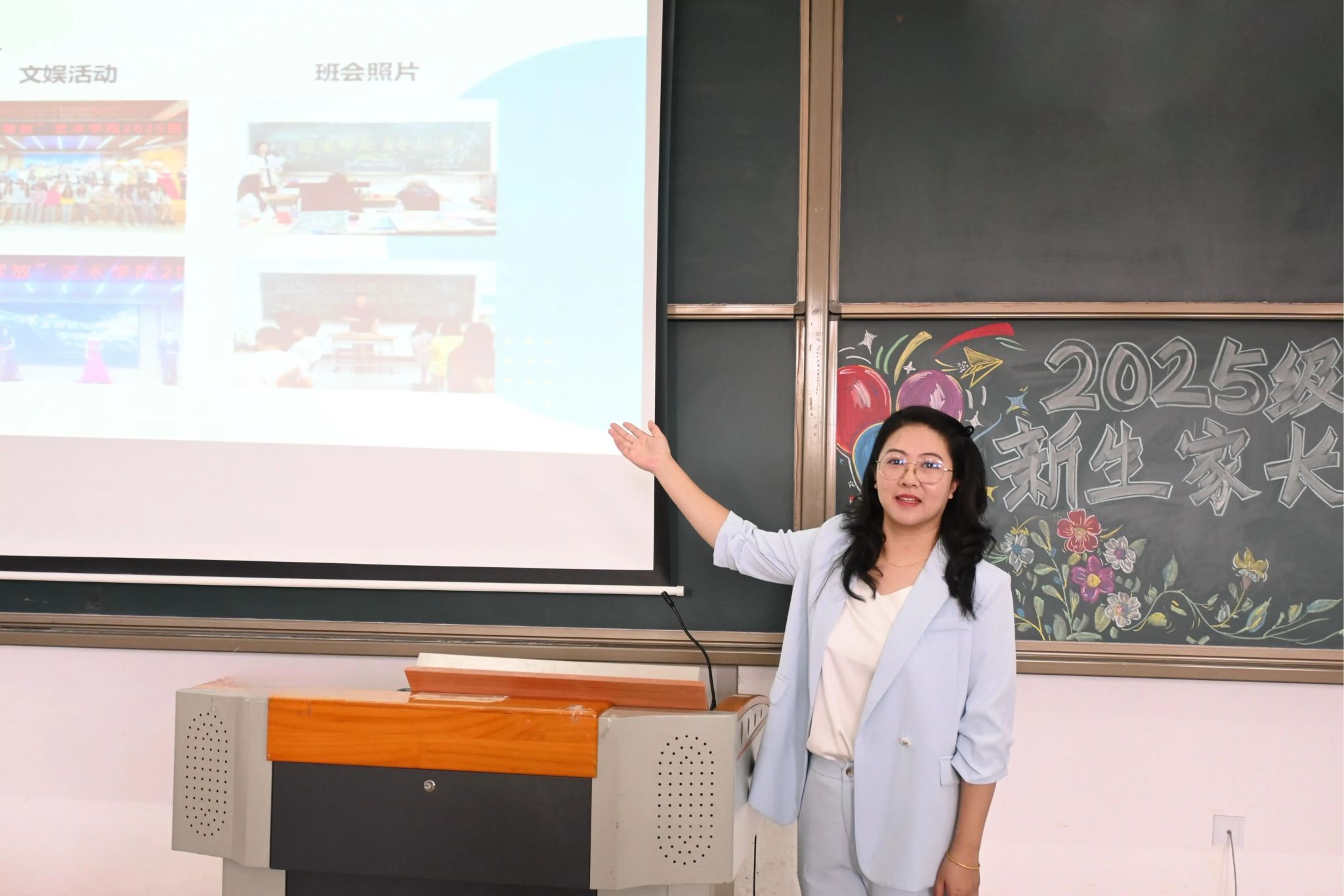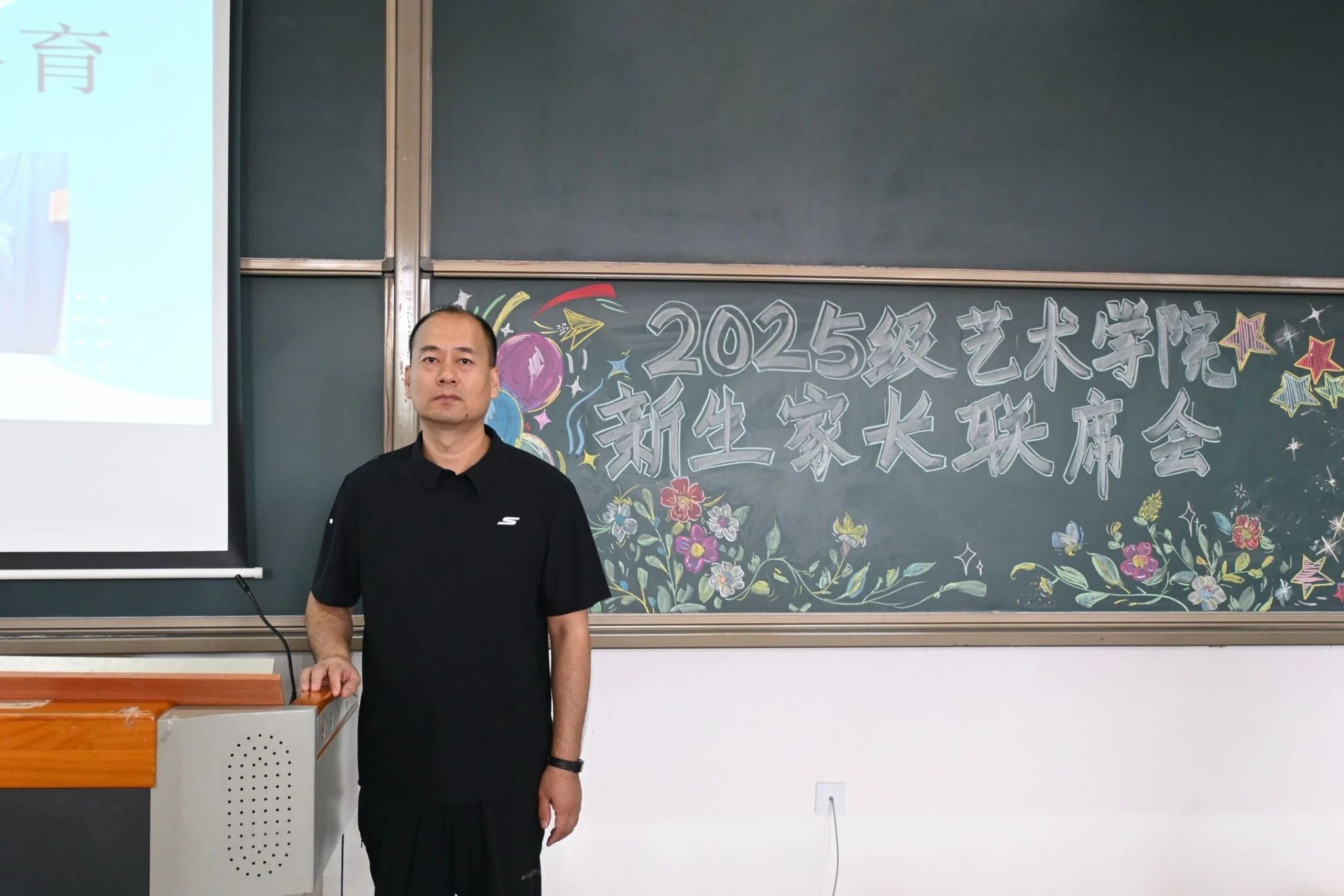 为了增进学院与新生家庭的沟通联系,构建家校协同育人桥梁,共同助力新生顺利开启大学阶段的学习与生活,艺术学院于2025年8月31日上午9:00在综合楼1112教室召开了2025级新生家长联席会。会议由辅导员张维老师主持。艺术学院院长潘宝泉教授、副院长刘松松副教授、院长助理李艳花副教授以及视觉传达设计专业负责人郑曼姝老师、辅导员王占利老师及2025级新生家长参会。