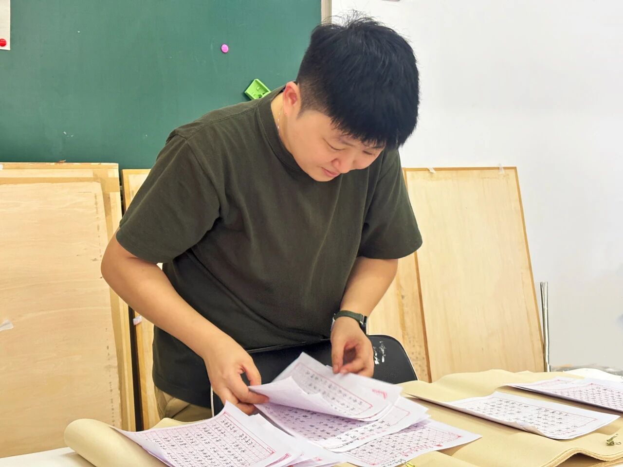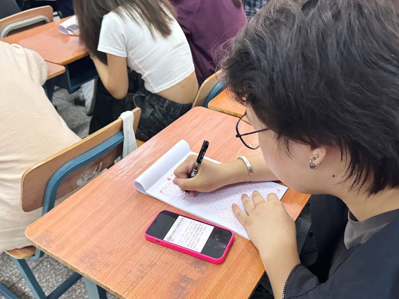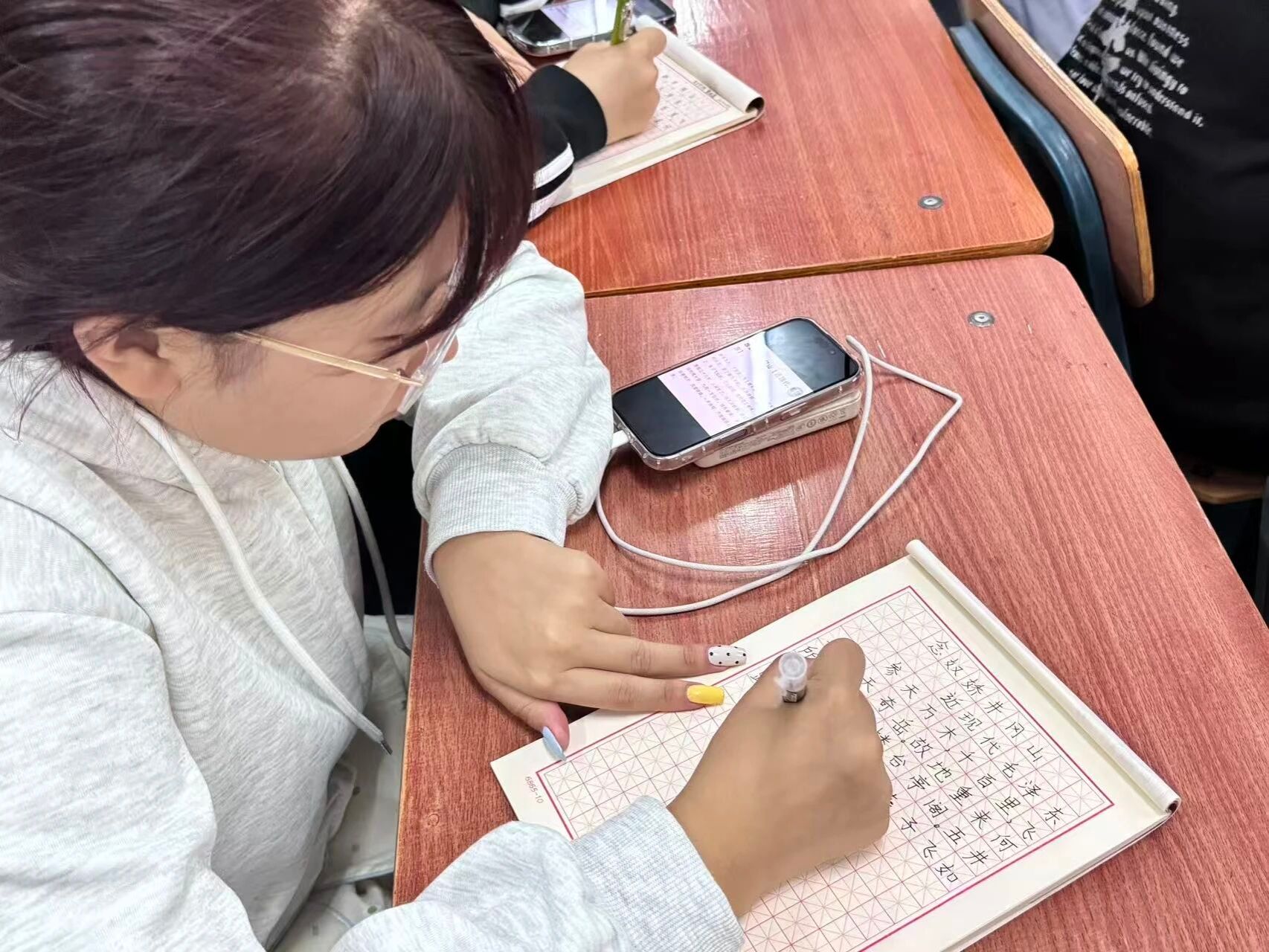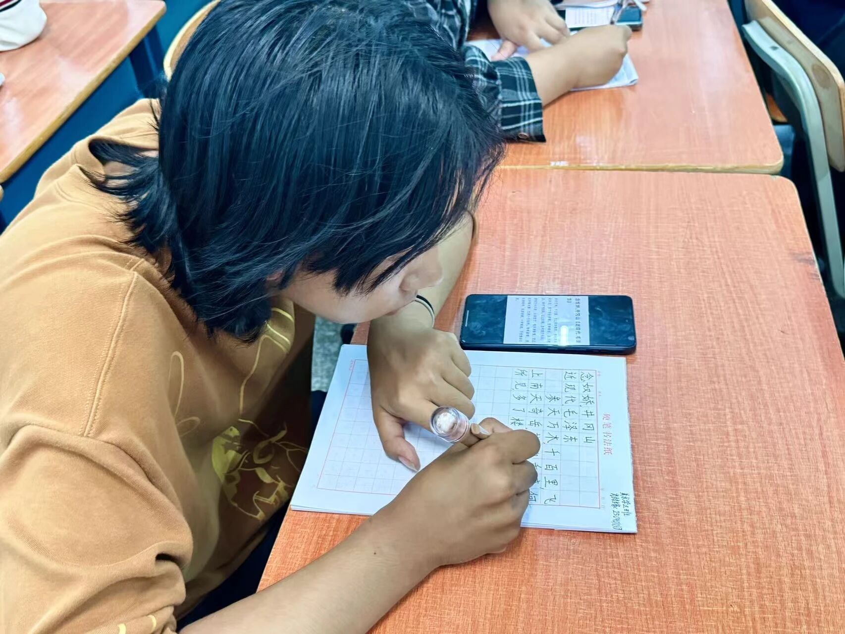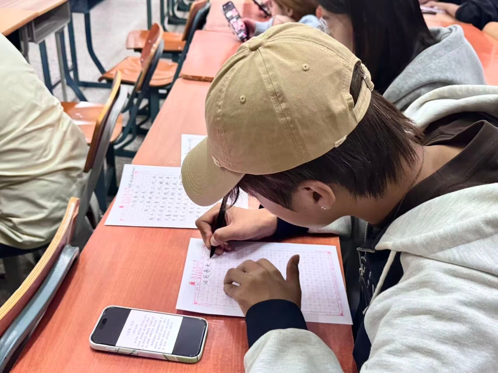 书写硬笔书法的同学,目光专注于米字格,执笔稳健,对每一笔画都细致雕琢,力求通过作品精准传递“抗战爱国”的主题内涵。