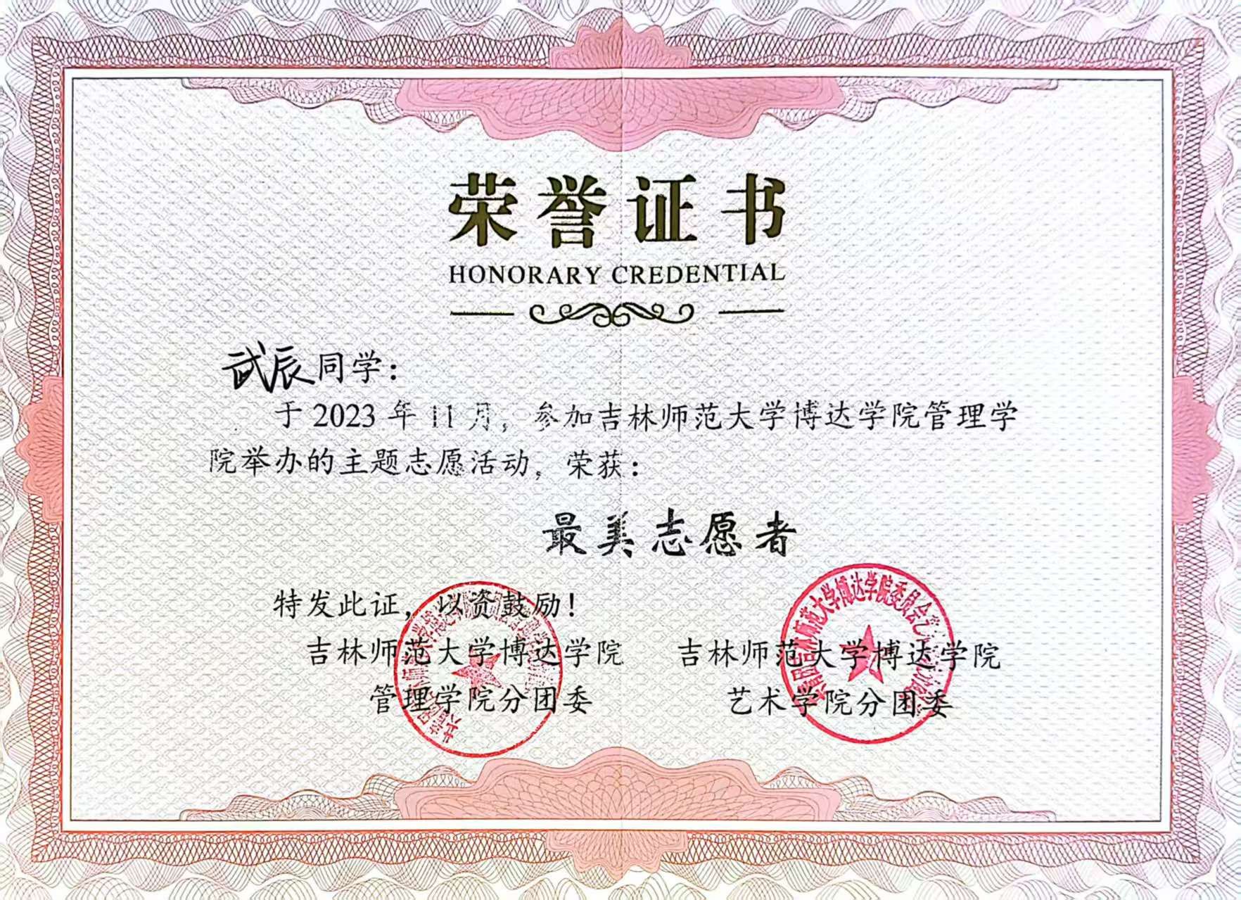 在2023年参加志愿者活动中荣获“最美志愿者“称号