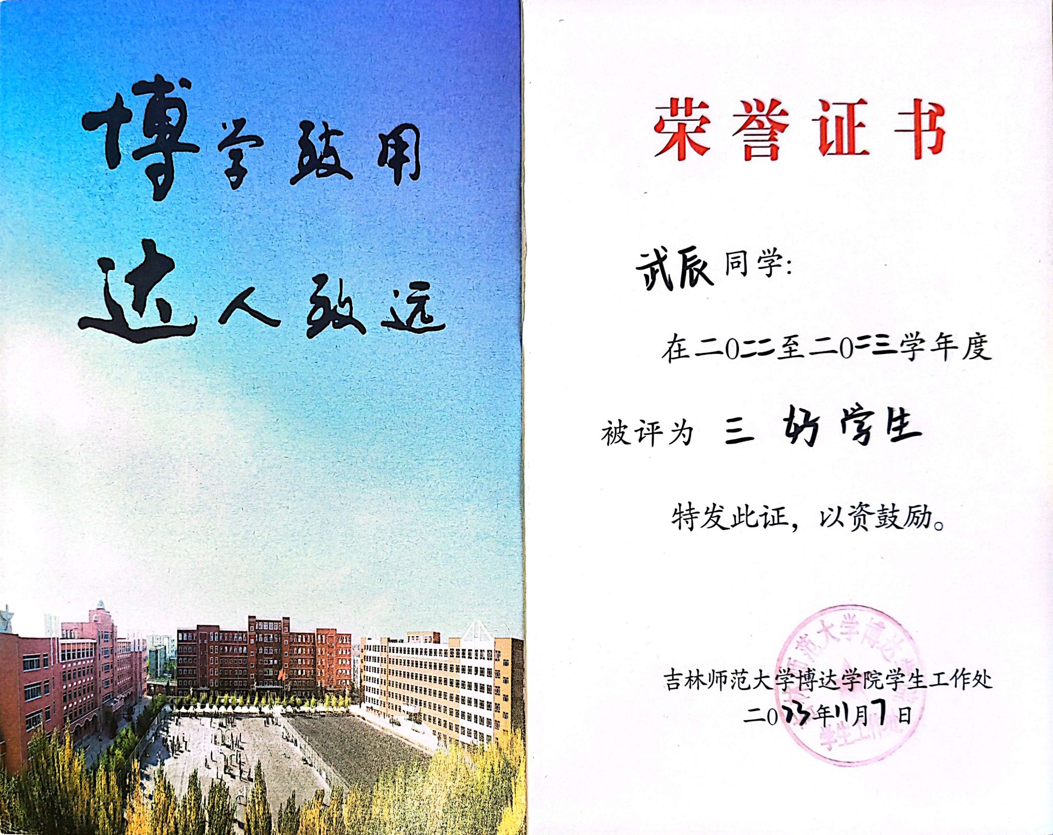 在2022-2023学年度被评为”三好学生”荣誉称号