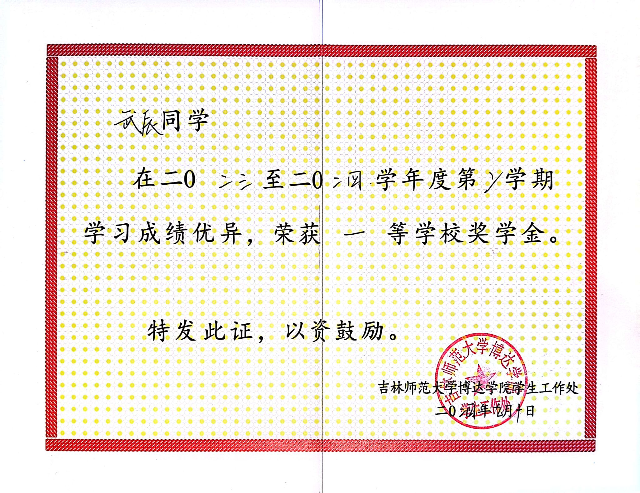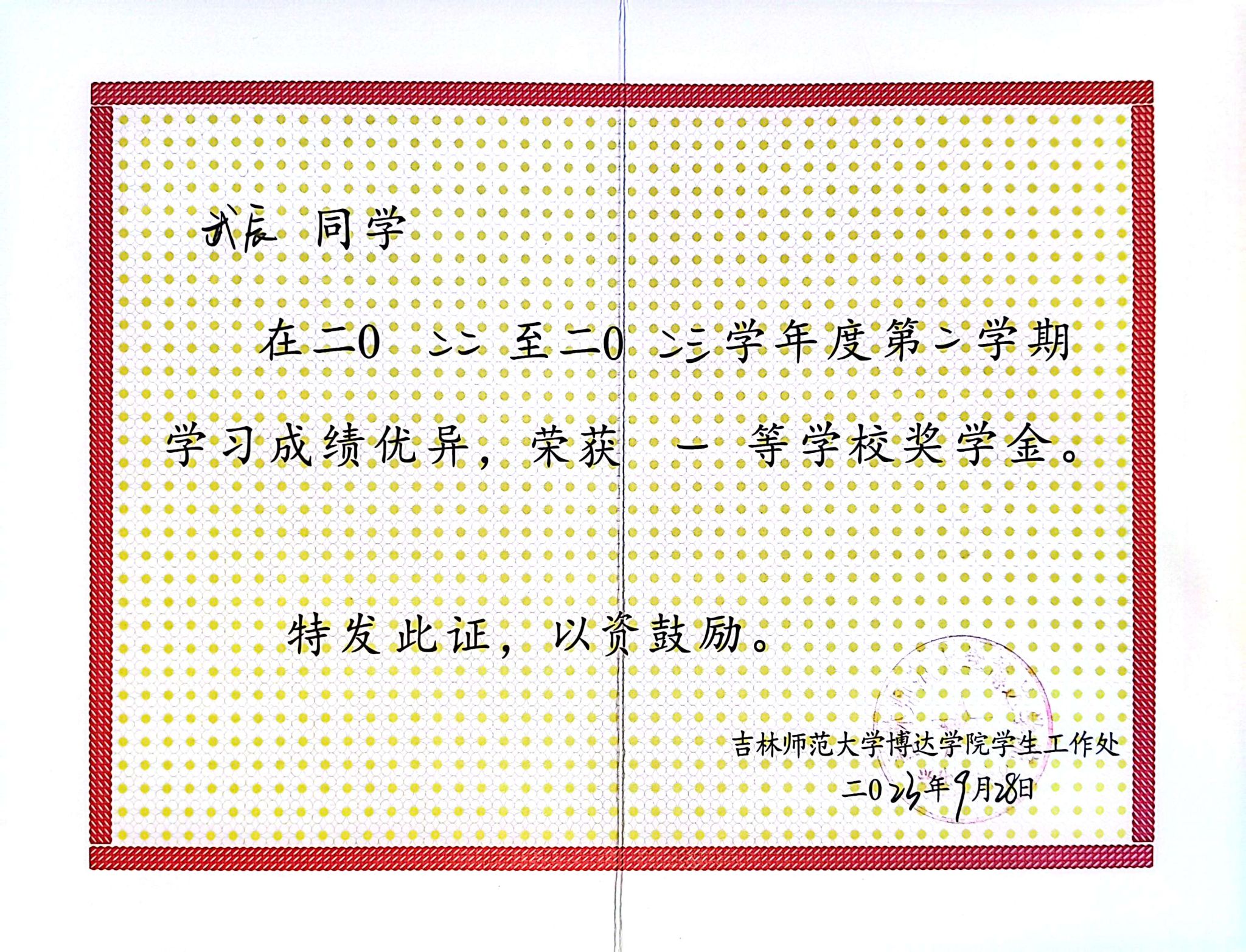在2023-2024学年度第二学期荣获一等专业奖学金