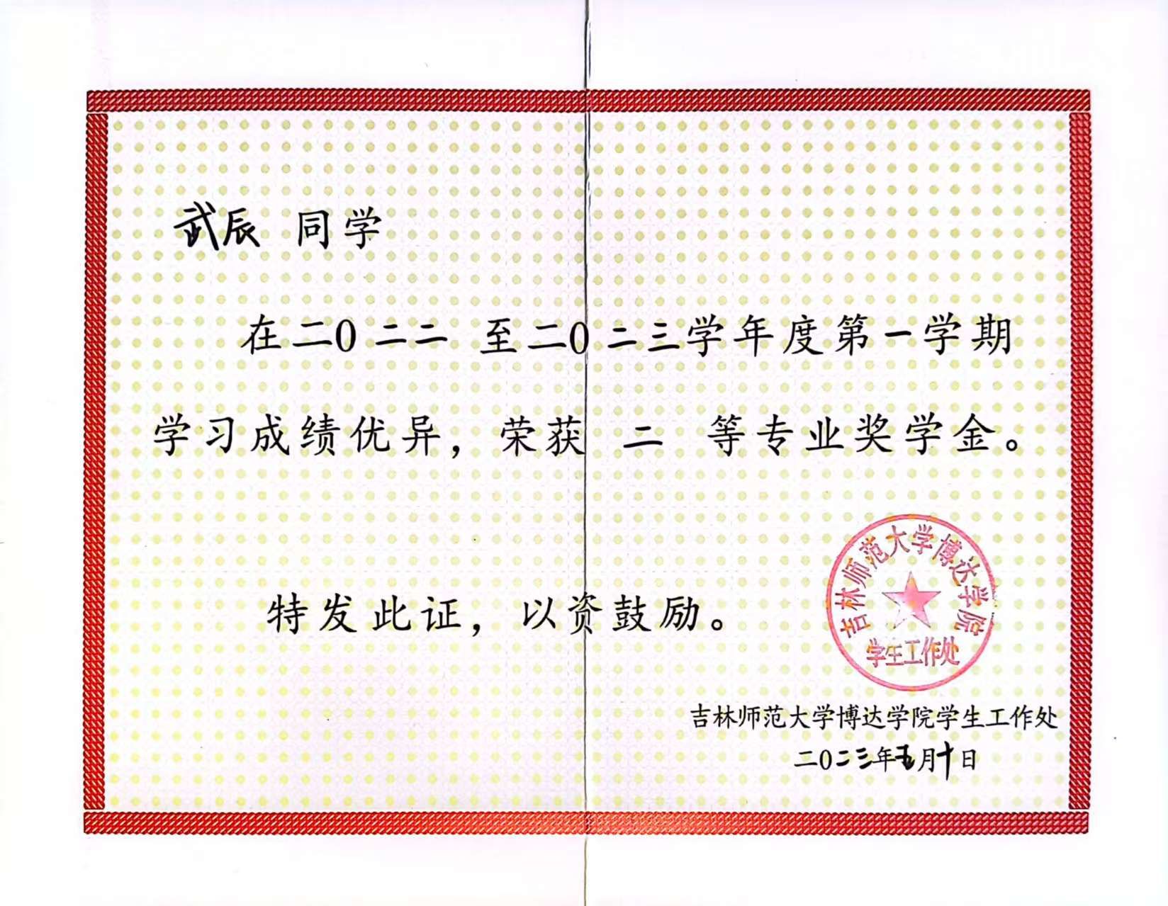 在2022-2023学年度第一学期荣获二等专业奖学金