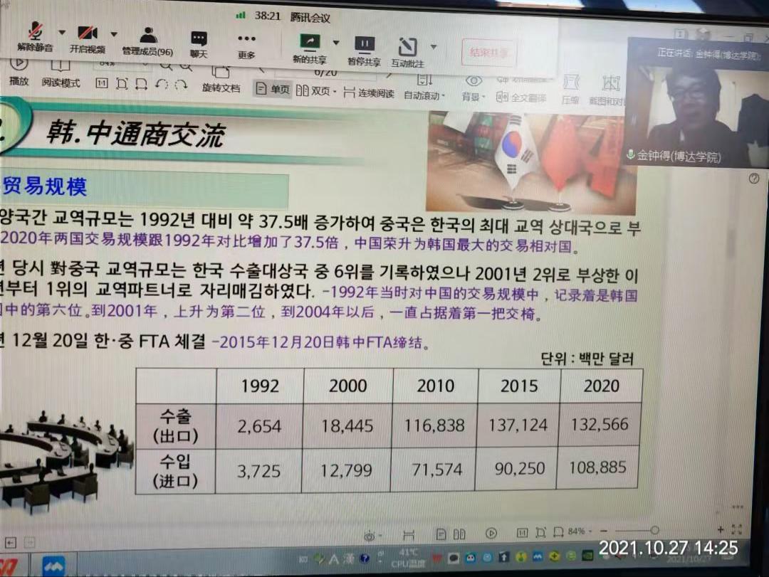 金教授在讲座中详细介绍中韩通商交流情况后,对国内韩国语专业现在和未来进行分析,并给学生们详细介绍韩国企业所需要的人才类型。告诉学生们在大学期间不仅要掌握韩国语方面的理论知识,还需要掌握韩国语以外的经营、贸易、会计、法律和税务等方面的知识储备,应对大学毕业市就业难题。在讲座中朝鲜语专业师生认真听讲,积极思考,反应热烈。讲座虽然是在线会议方式进行,但金教授和师生之间的互动频繁,讲座效果很好。