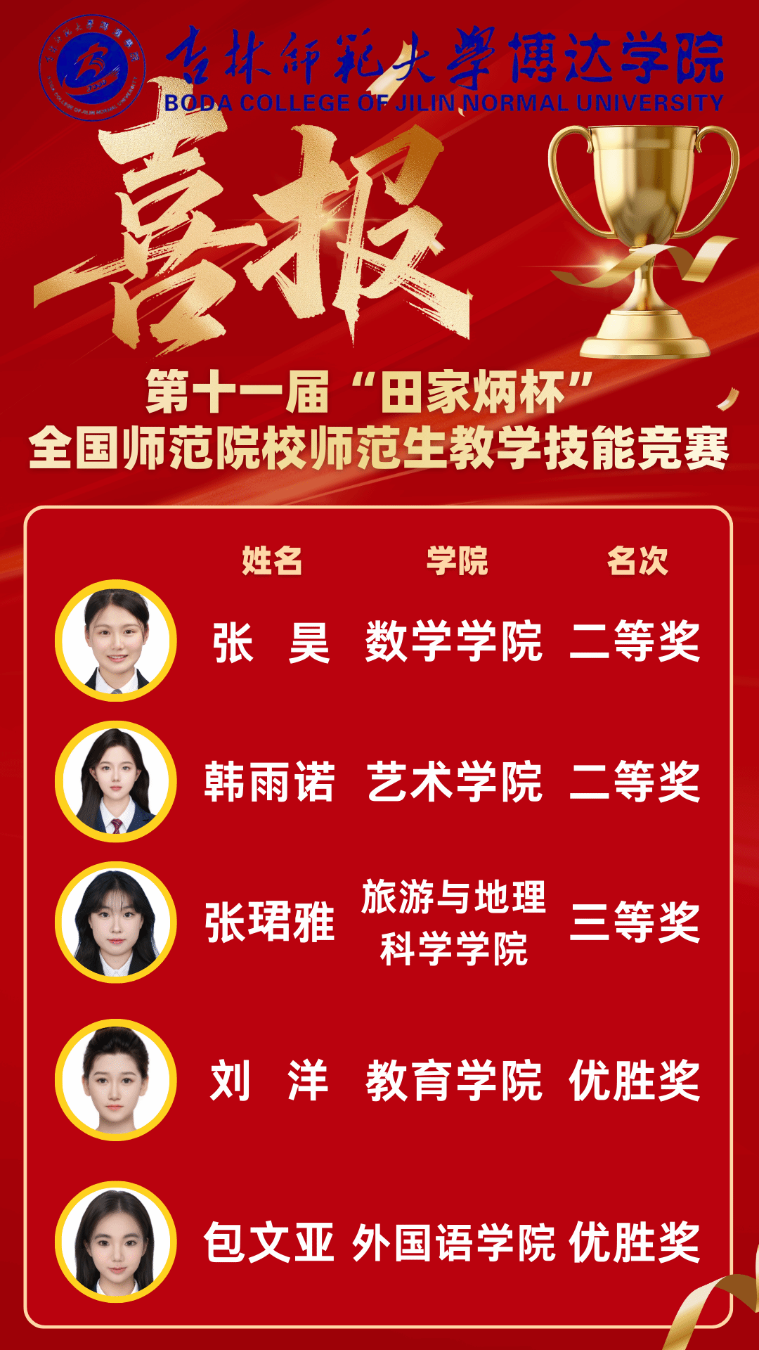 此次佳绩的取得,是参赛学子刻苦钻研、精益求精的结果,更是各学院精准培育的生动体现。未来,学校将以此次赛事为契机,总结备赛经验,进一步完善师范生实践教学体系,加强教学技能训练与创新能力培养,持续提升人才培养质量,努力培育更多具备教育家精神、适应新时代基础教育发展需求的“四有”好老师,为区域教育事业高质量发展贡献力量。