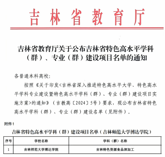 近日,吉林省教育厅发布了《关于公布吉林省特色高水平学科(群)、专业(群)建设项目名单的通知》,学校“吉林特色资源食品深加工”学科群获批吉林省特色高水平学科(群)建设项目。