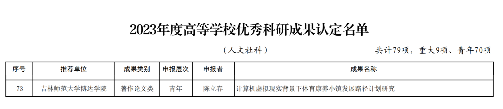 近日,吉林省教育厅发布了2023年度高等学校优秀科研成果认定名单,我校陈立春老师的论文《计算机虚拟现实背景下体育康养小镇发展路径计划研究》被认定为2023年度高等学校优秀人文社科类成果。