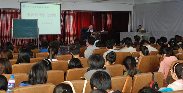 王树海教授从佛禅的生命哲学讲起,谈到佛禅对中国古代文人心灵情感、创作心态与艺术思维的影响,通过援举大量经典的诗作向大家阐释佛禅与诗歌之间的相互渗透以及佛禅赋予诗歌的新理趣、新审美、新意境。通过本次讲座,师生们领悟到佛禅与诗歌的思想渊源,正是禅家“不立文字”和“不离文字”的深刻悖论,使其终于找到了“不诳语”亦“不确语”的诗歌,两者在思维的直觉方式上合乎逻辑地走到了一起。诗歌长期为禅门青睐,还有生命传达的诱惑以及为这种诱惑所驱使的生命之实行精神,构成了相辅相成的混整的教外原因。
