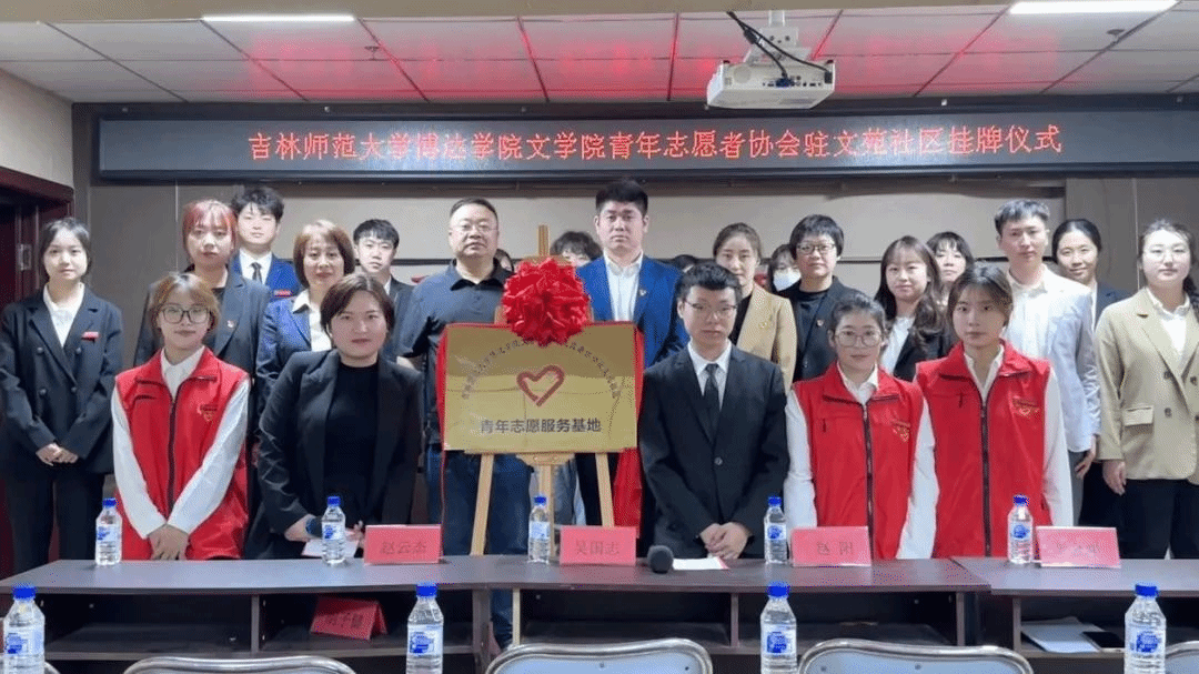 志愿服务是社会文明进步的重要标志,是新时代党引导动员人民群众贡献智慧力量、创造美好生活、实现奋斗目标的生动实践。立足新时代、展现新作为,为弘扬青年志愿者“奉献、友爱、互助、进步”的志愿精神,发挥创造力和能动性,更好地将爱心带进社区,继续以实际行动书写新时代的雷锋故事。5月7日上午,吉林师范大学博达学院文学院党支部与文苑社区党委举行志愿服务基地揭牌仪式。出席本次揭牌仪式的嘉宾有英雄街道党工委副书记吴国志、文苑社区党委书记赵云杰、吉林师范大学博达学院文学院党支部书记赵阳老师,文学院辅导员贾金媛老师,李艳雪老师,刘尧老师,赵洋老师,及文学院行政助理刘晓桐学姐等。