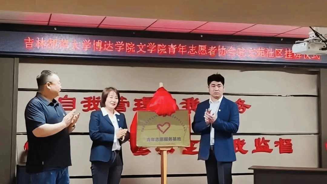 最后,进入仪式的第四项,由文苑社区党委书记赵云杰和吉林师范大学博达学院文学院党支部书记赵阳共同揭牌。这块牌匾包含着对志愿者们的嘉奖,标记着社区对志愿者的真诚与信任,寄托着对志愿服务的希望,镌刻着社区对志愿者的厚爱,激励着青年志愿者们在志愿服务的道路上勇毅前行。