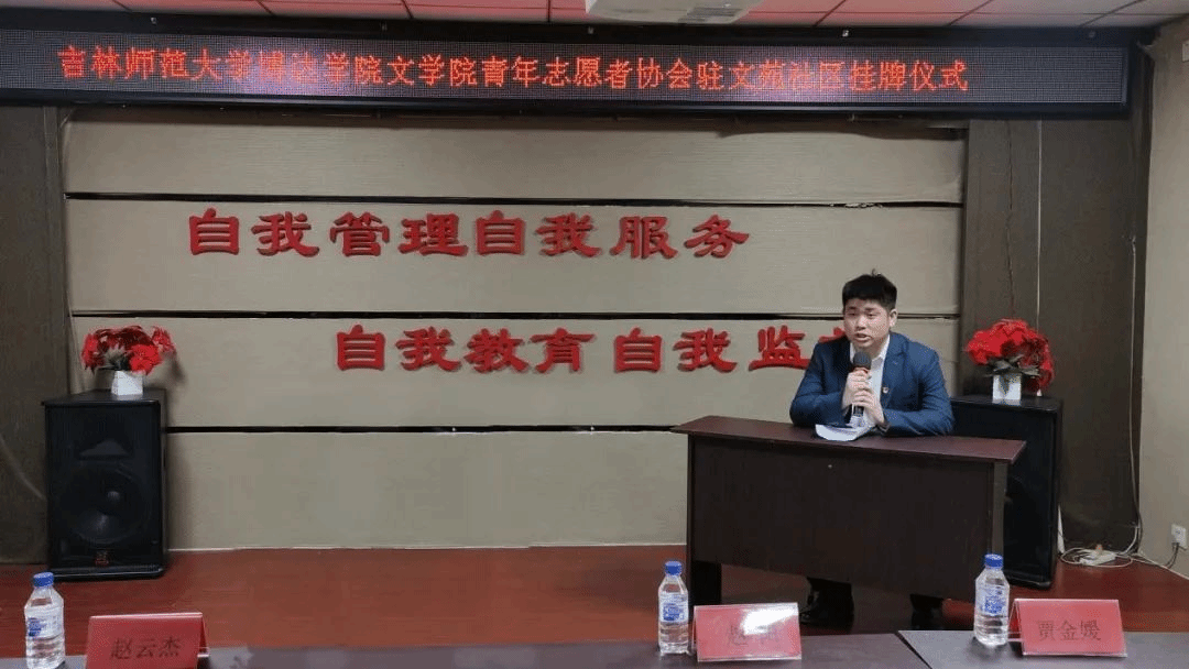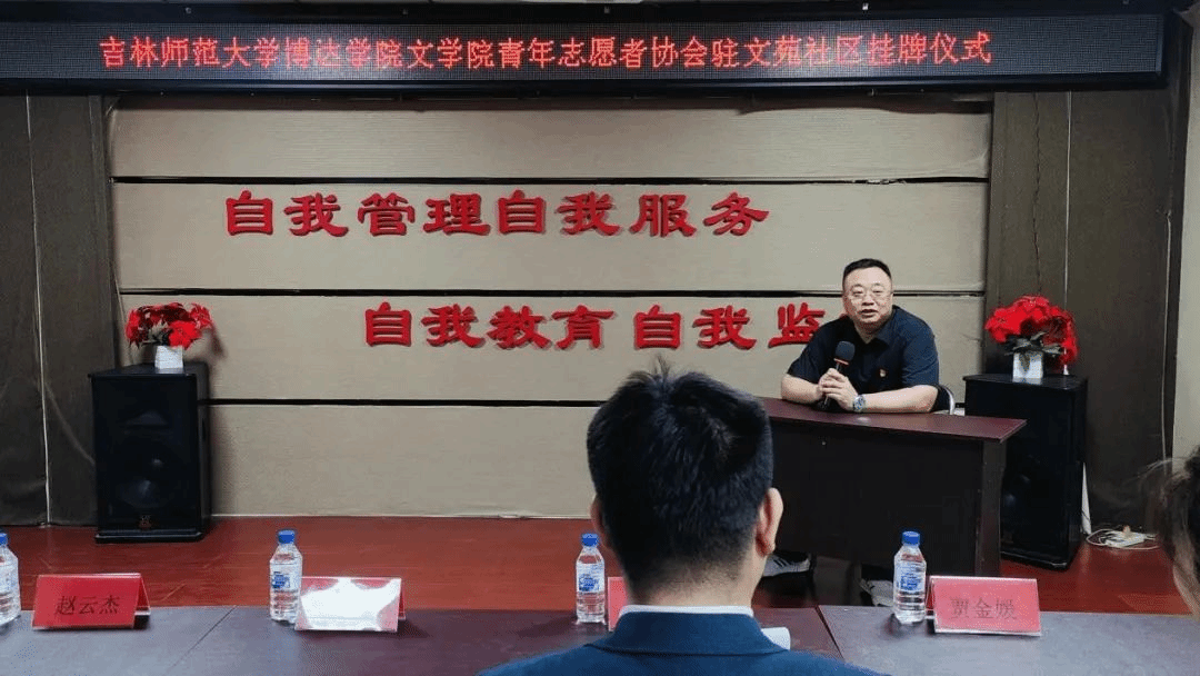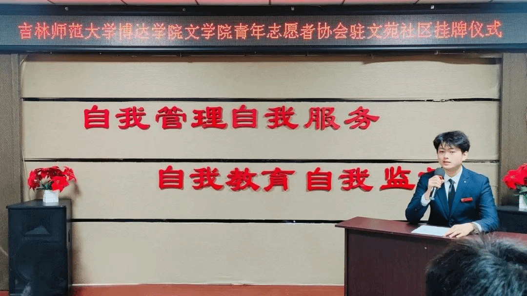 接着进入仪式的第二项,由吉林师范大学博达学院文学院党支部书记赵阳发表讲话,赵阳老师表示,吉林师范大学博达学院文学院在学校党委的带领下,坚持以党建为引领,与专业特色相结合,建设了以“三风三新”为载体的党建工作体系,希望在未来发展道路上,坚定信心,不断完善基地管理机制,提高志愿服务的质量和水平,让志愿服务真正成为学校和社区、社会的骄傲,让我们携手共进,为建设更好的未来努力奋斗。