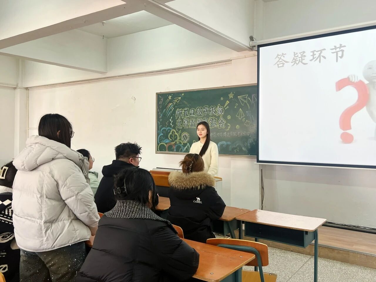 交流会邀请第十一届“田家炳杯”全国师范院校师范生教学技能竞赛国赛体艺组二等奖获得者、2022级韩雨诺同学做经验分享。她围绕国赛五大环节(教学设计、课件制作、说课、模拟上课、板书设计)的具体要求与备赛要点进行系统讲解,同时,结合自身参赛经历对教学目标设定、内容逻辑构建、课堂互动设计、思政融入等方面进行了分享,在分享结束后,对现场同学的相关赛事咨询进行了细致耐心的解答。