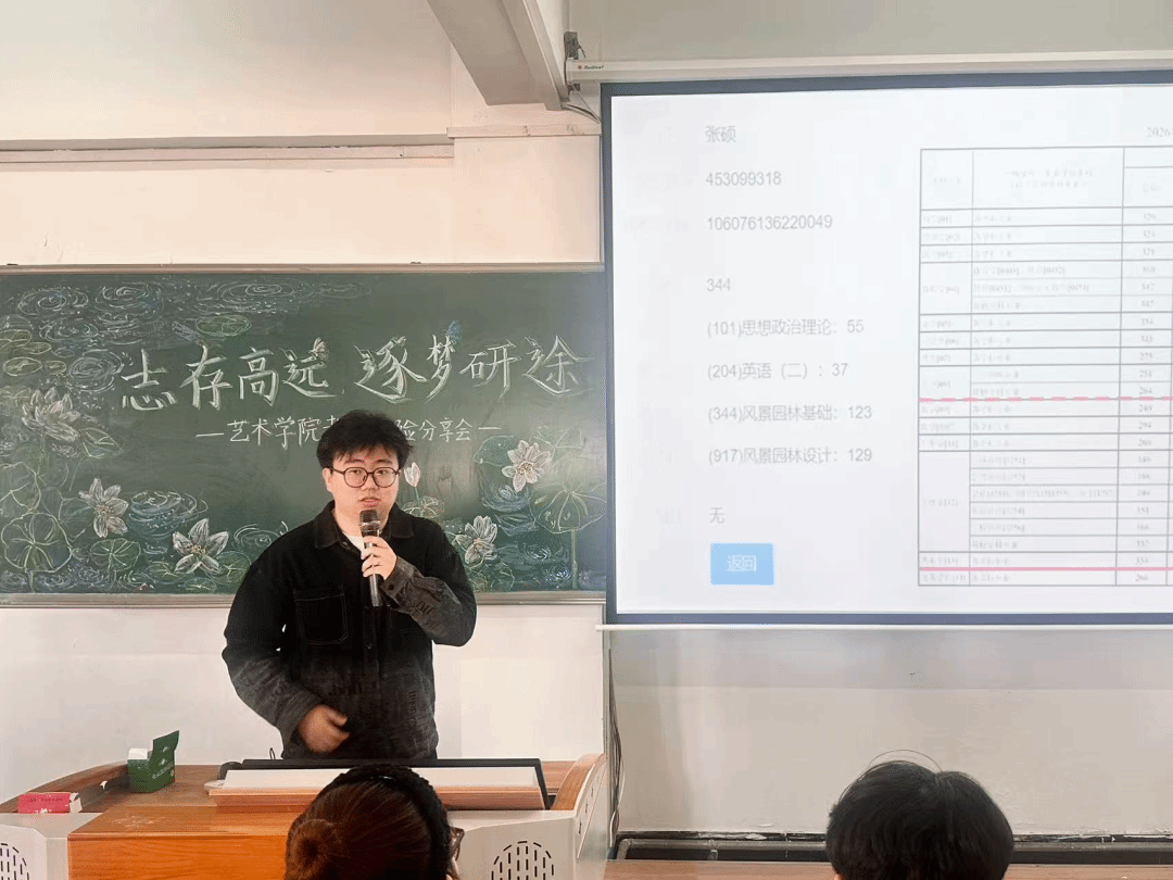 在分享环节中,各位学长学姐结合自身经历,从多个维度分享了宝贵经验:环境设计专业的张硕学长聚焦于时间利用与效率提升。他坦言,艺术专业学生常需兼顾课堂创作与考研复习,因此高效的时间管理至关重要。他分享了如何保证每日在固定时段进行英语、政治等公共课学习,并整合碎片化时间进行设计案例积累与理论记忆,从而实现专业学习与考研备考的并行不悖。